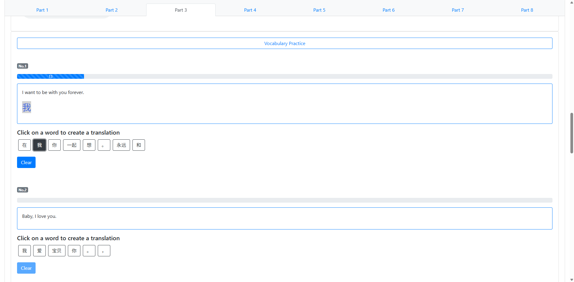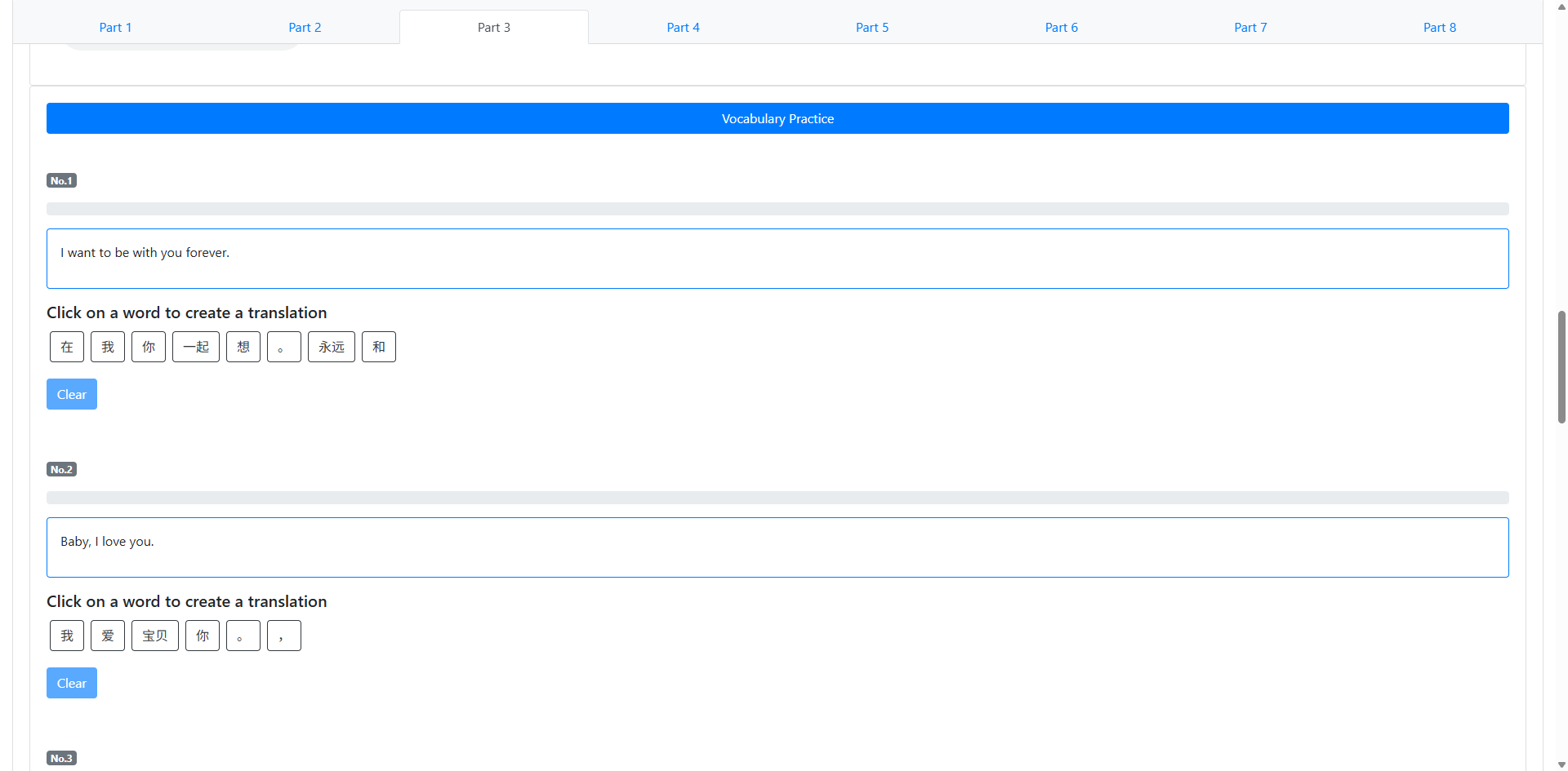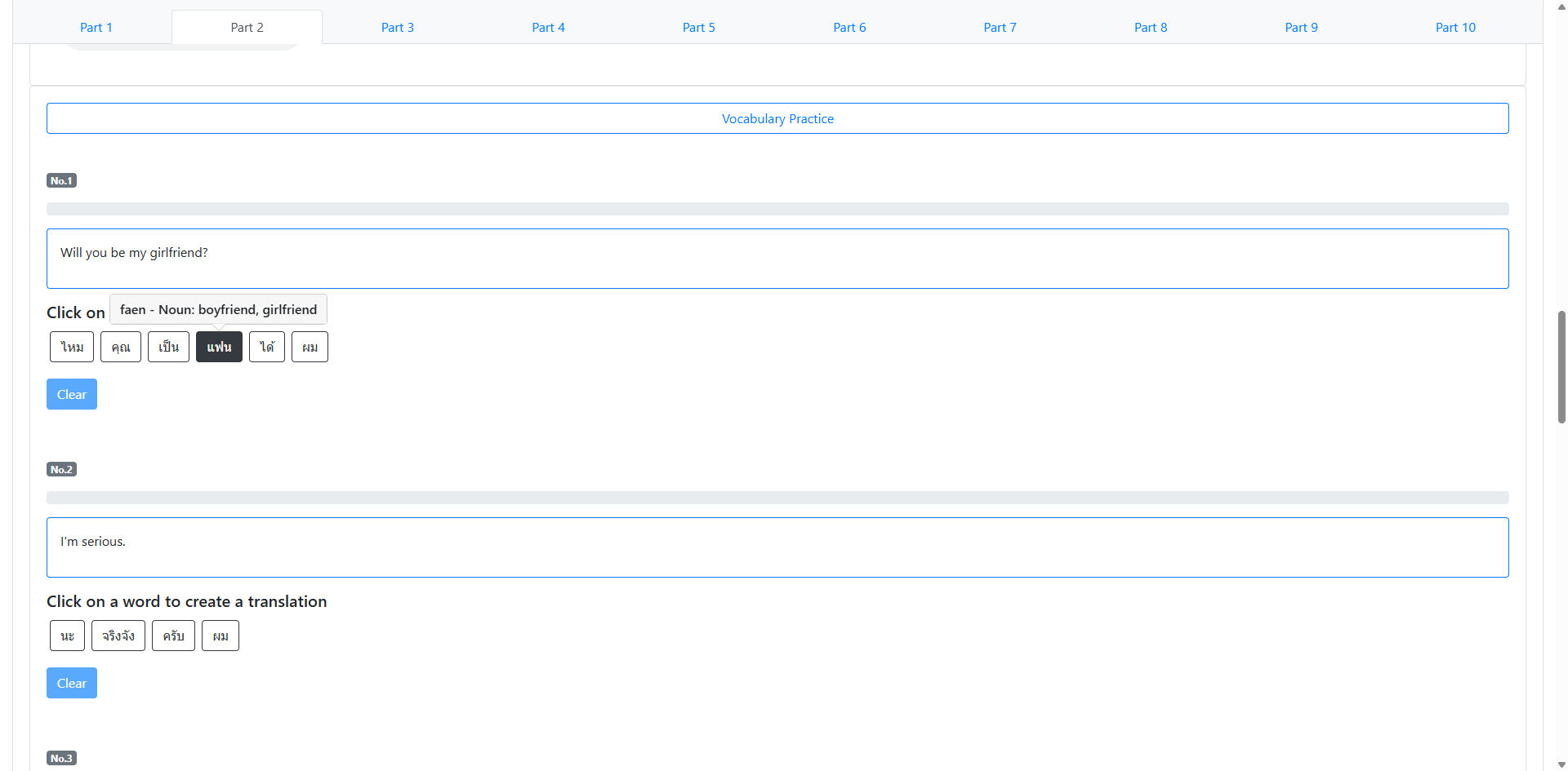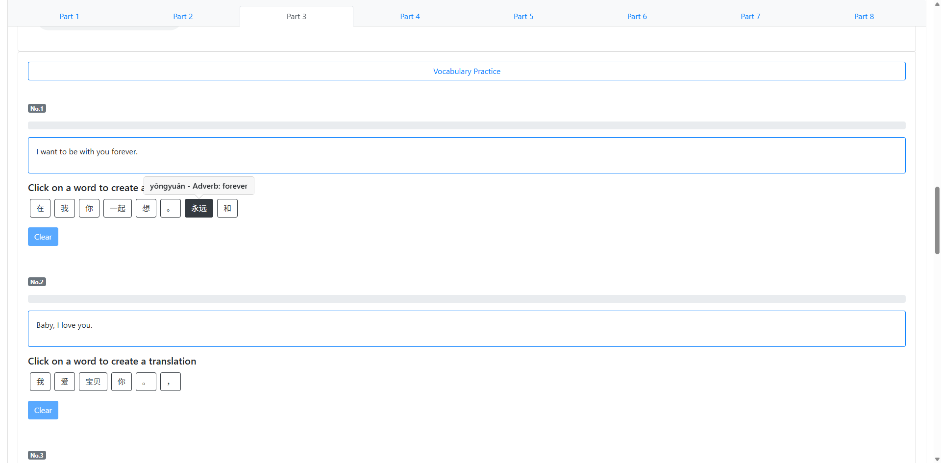 Each sentence has a translation, pronunciation, and explanation of the words that make up the sentence. There are also exercises to make sentences using the words.