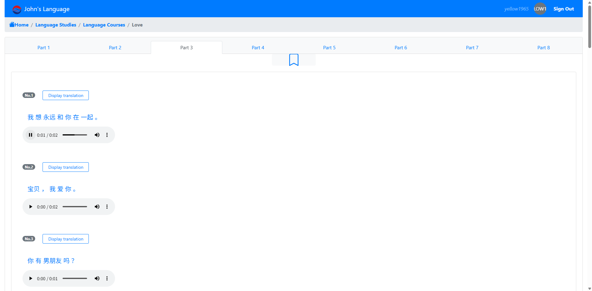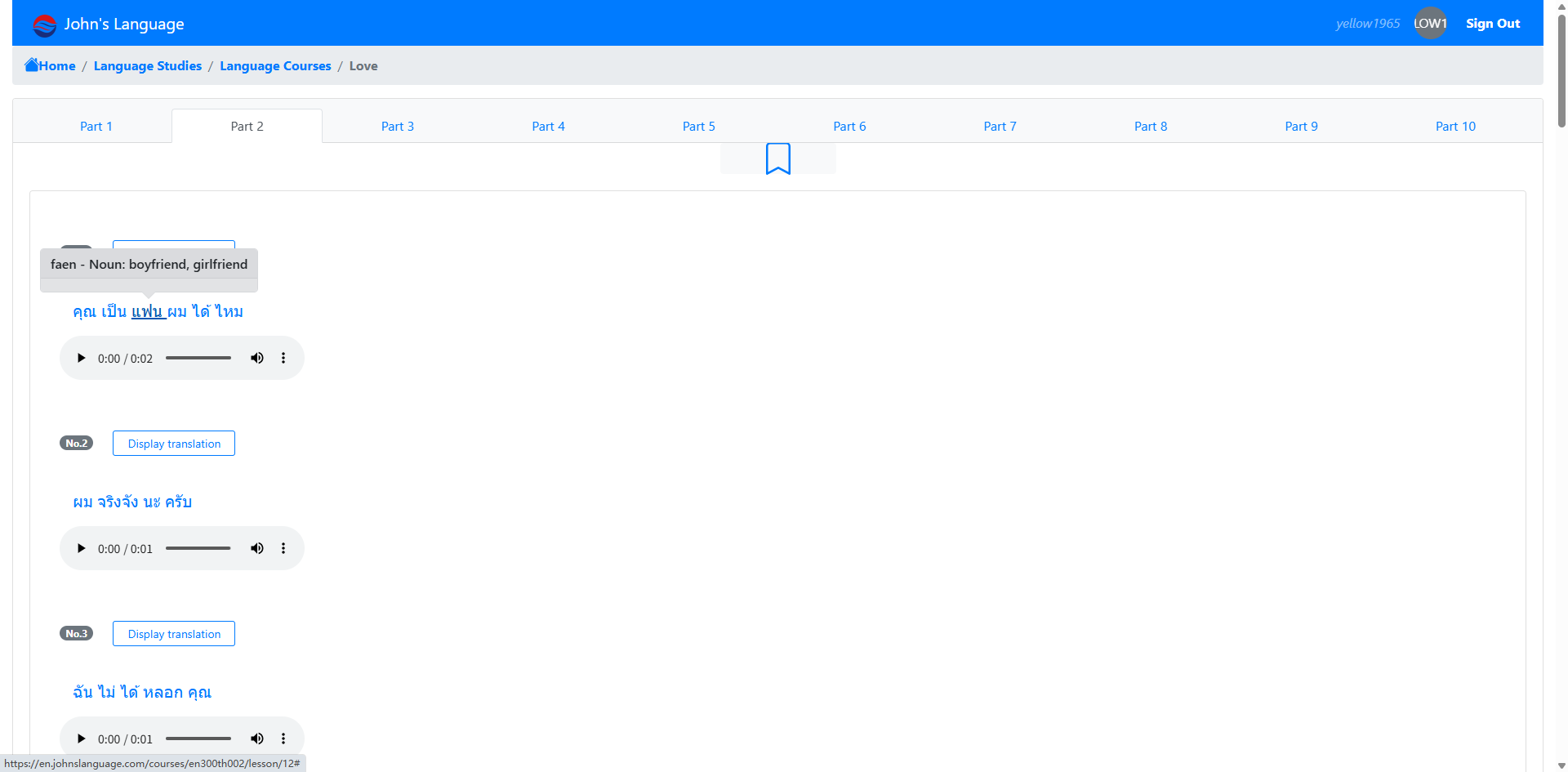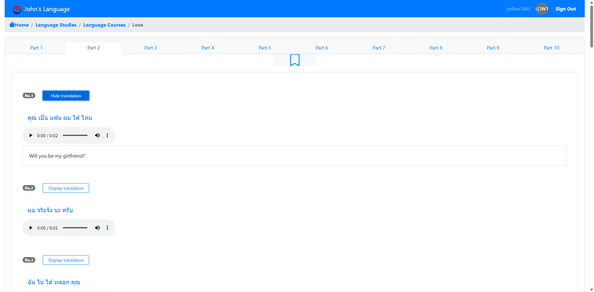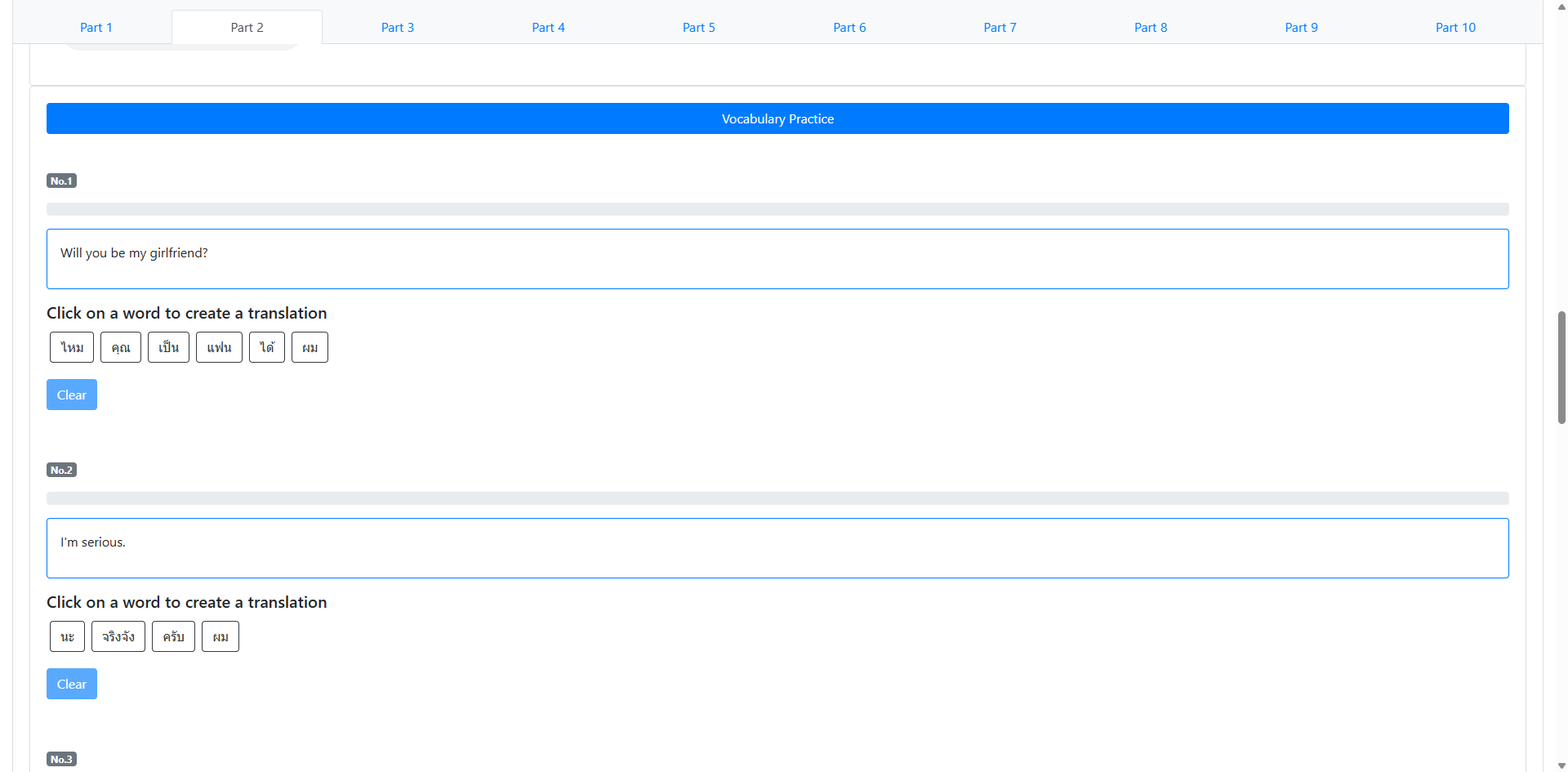 Each sentence has a translation, pronunciation, and explanation of the words that make up the sentence. There are also exercises to make sentences using the words.