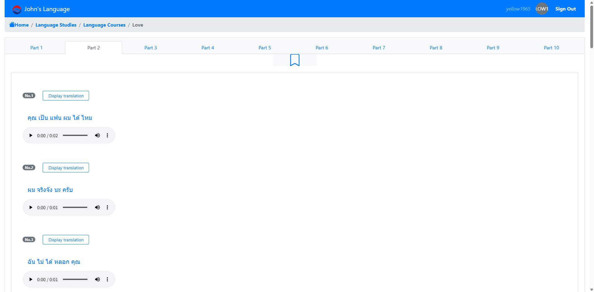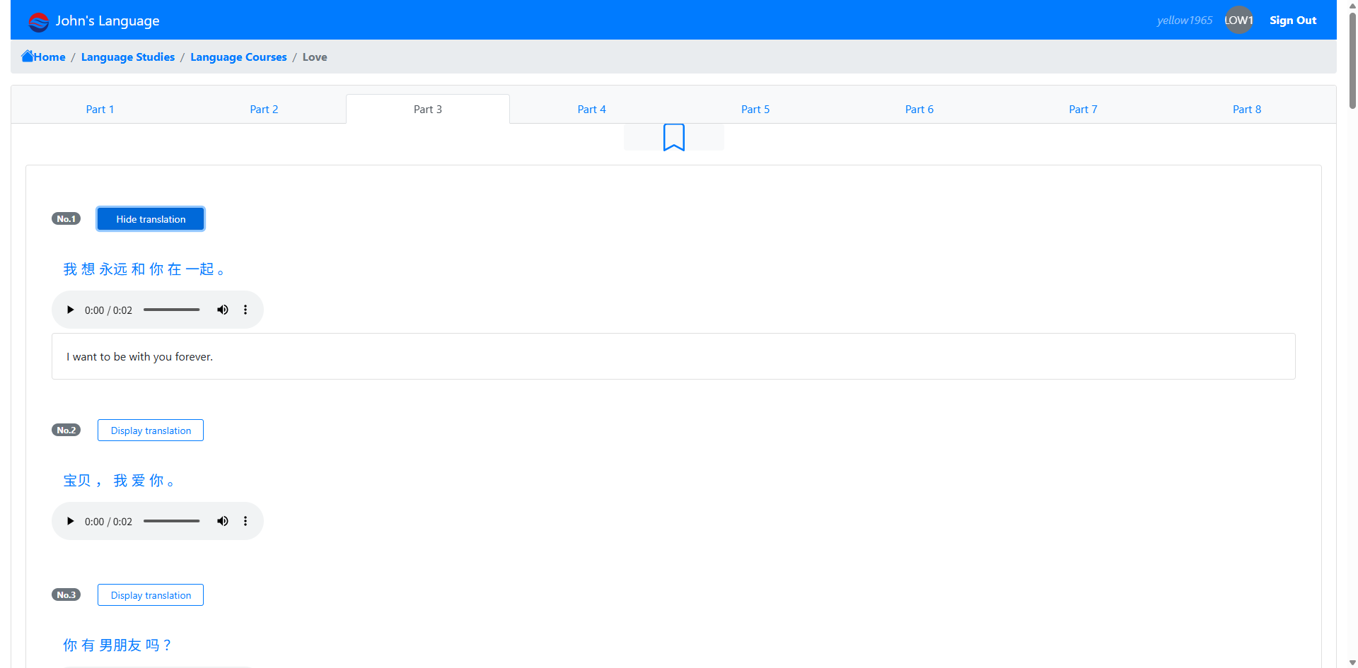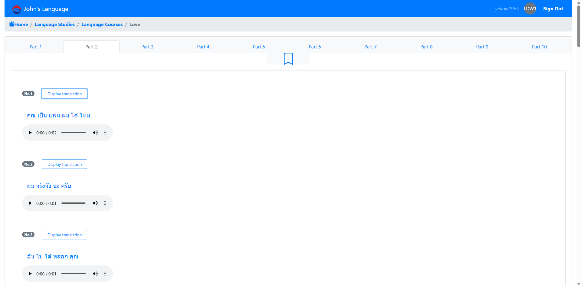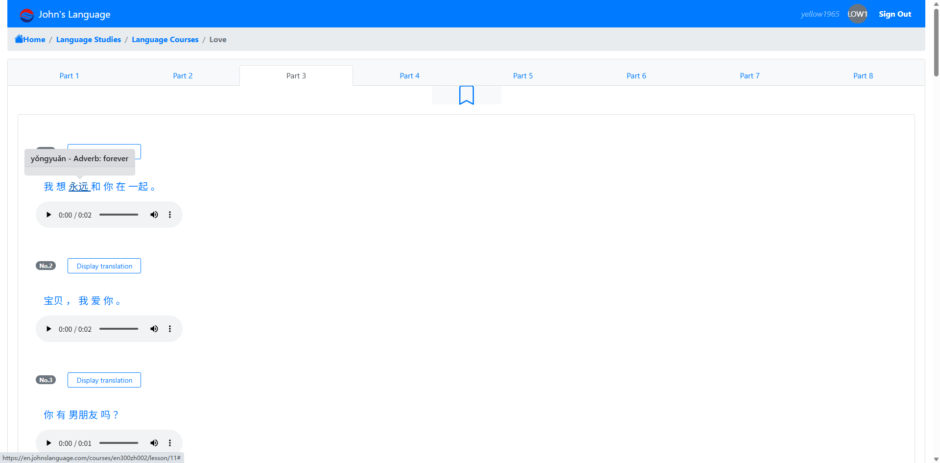 Each sentence has a translation, pronunciation, and explanation of the words that make up the sentence. There are also exercises to make sentences using the words.